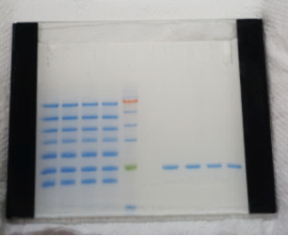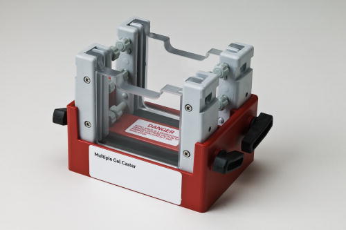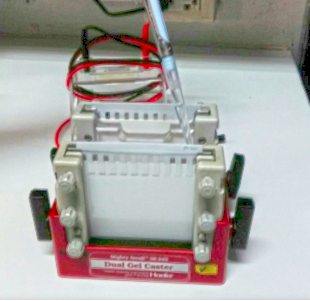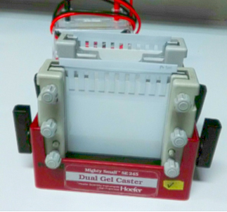 นำกระจก (glass plate) ขนาด 8x10 เซนติเมตร และ notched alumina plates มาเช็ดทำความสะอาด จากนั้นนำกระจกและ notched alumina plates มาประกบกันโดยมี spacer คั่นไว้ตรงกลาง จากนั้นนำมาประกอบเข้ากับ dual gel caster (ดังภาพ)