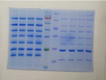 เมื่อนำเอา protein marker และโปรตีนที่ต้องการทราบน้ำหนักโมเลกุลไปทดสอบด้วยวิธีการทำ Electrophoresis แบบ SDS-PAGE ดังรูป