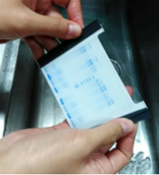Tips: ควรทดสอบการรั่วของกระจกทุกครั้งโดยการนำน้ำมาเติมให้เต็มช่องว่างระหว่างกระจกกับ notched alumina plates ทิ้งไว้ประมาณ 10 นาที ถ้ามีการรั่วไหลน้ำในกระจกจะลดระดับลงมา (ต้องทำการเตรียม gel sandwich ใหม่)