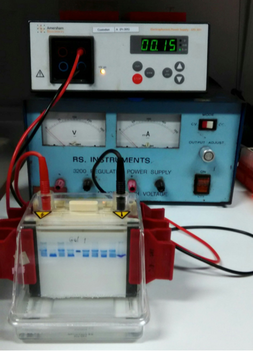 หลังจากโหลดตัวอย่างโปรตีนเรียบร้อยแล้วให้ปิดฝา (safety lid) ให้แน่น จากนั้นต่อขั้วไฟฟ้าเข้ากับ power supply ให้ถูกต้อง ตั้งค่าความต่างศักย์ (voltage) และเวลา เริ่มทดสอบ (ดังภาพ)